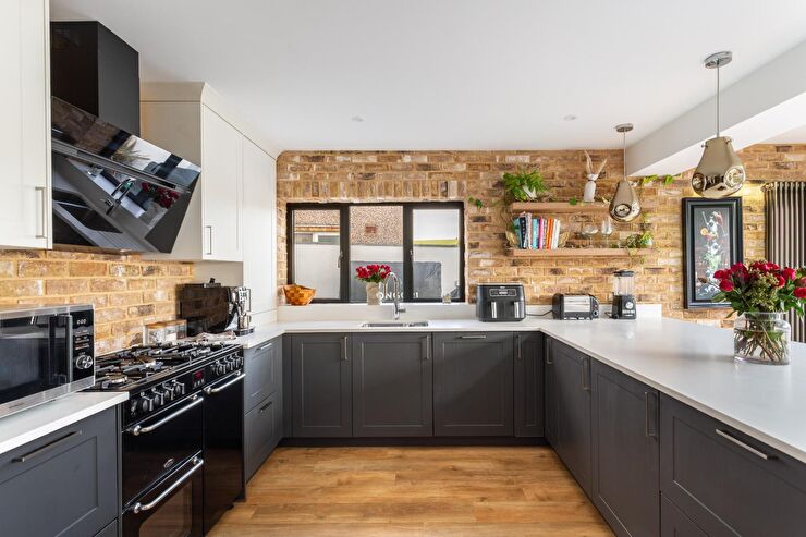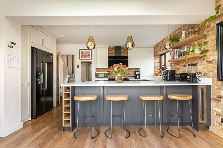Range of wall, base & drawer units with with square edged work surfaces over, inset 1.5 bowl stainless steel sink unit with integrated drainer & ‘Quooker’ tap, integrated dishwasher, integrated washing machine, space for fridge/freezer, space for range style cooker with extractor over, cupboard housing wall mounted boiler, window to side, recessed spotlights, feature brick wall, 2x upright radiators, bifold doors to rear, wooden flooring, breakfast bar seating, integrated wine cooler.