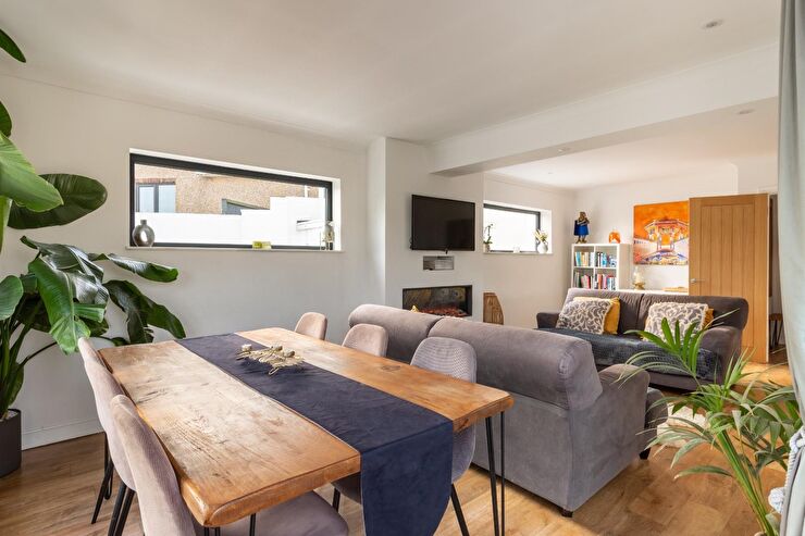 Wooden flooring, 2 x radiators, recessed spotlights, feature fire, 2 x high level windows, window to rear with views of the downs, sliding doors to rear garden.