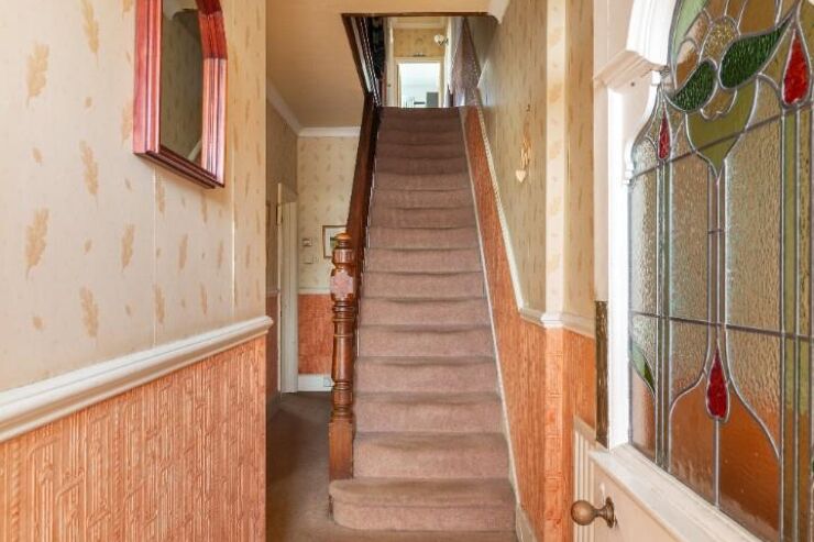 Radiator, dado rail, stairs rising to first floor, doors to all rooms, under stairs storage cupboard, wall mounted heating thermostat.