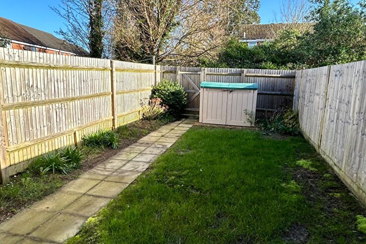 Off road parking for one vehicle. Bin store area. Flowerbed borders with a path leading to the main entrance.