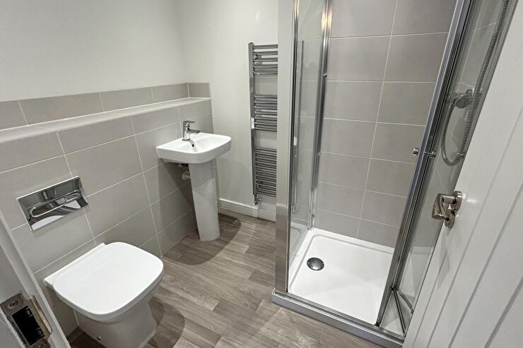 Corner shower cubicle. Low level WC. Pedestal wash hand basin. Chrome ladder style radiator.