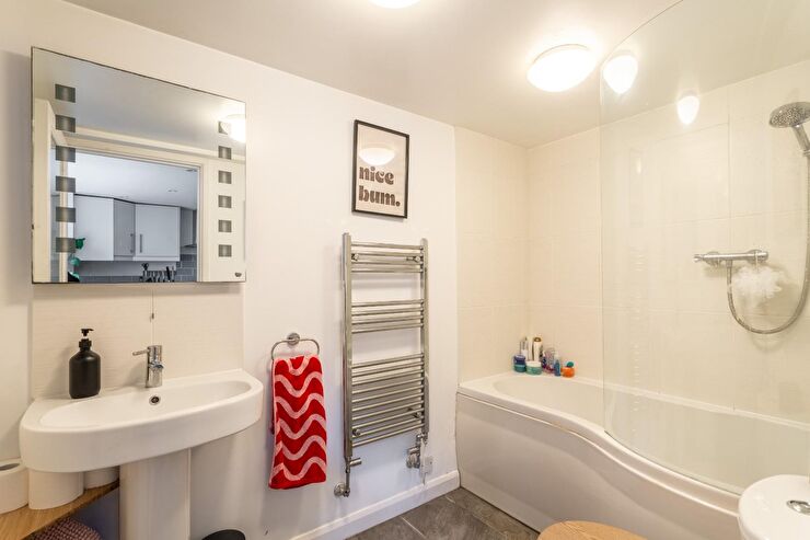 A modern bathroom comprising 'P' shaped bath with mains fed shower over, pedestal wash hand basin with mixer tap, WC, chrome ladder style towel rail, tiled floor with underfloor heating, uPVC double glazed window with frosted glass.