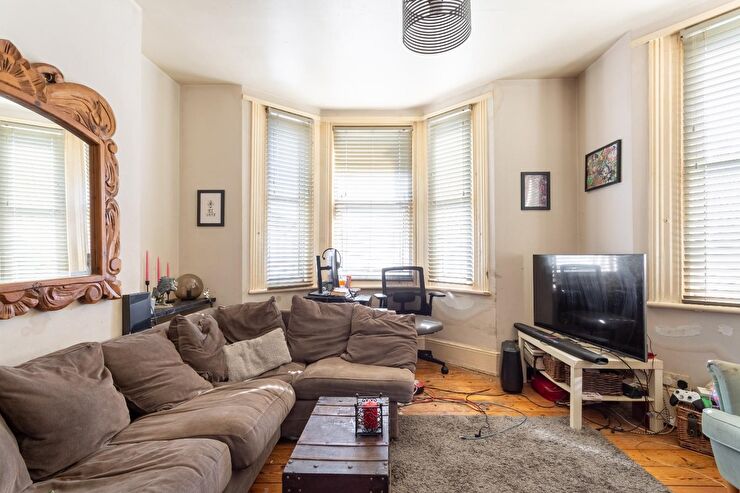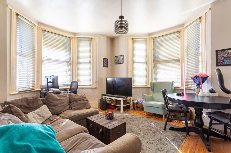 A dual aspect room with 2 x large bay windows, polished floorboards, tall skirting boards, radiator, high ceilings.