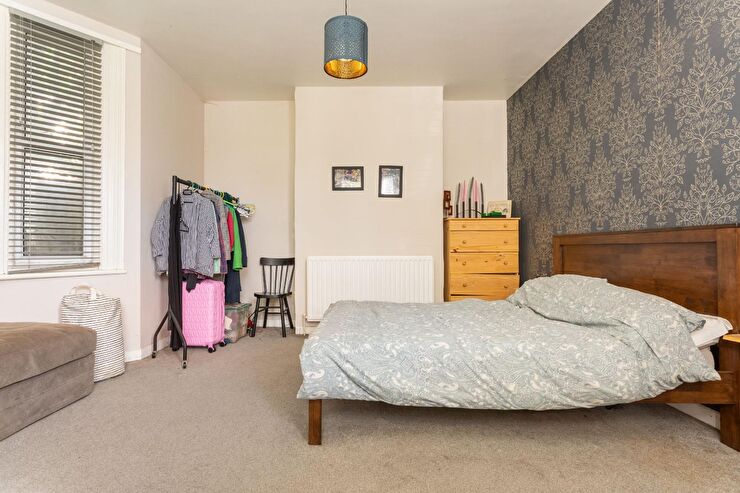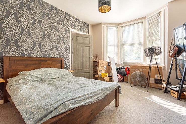 A spacious dual aspect double bedroom with double glazed windows to 2 bays overlooking the garden & Roundhill Crescent, radiator, high ceiling.