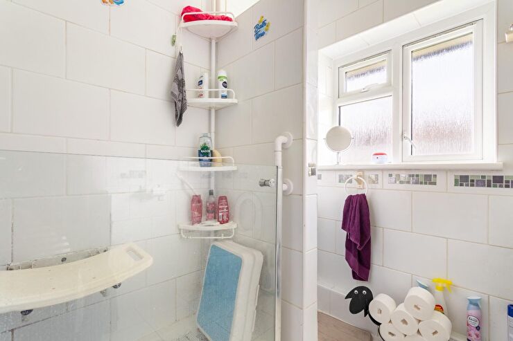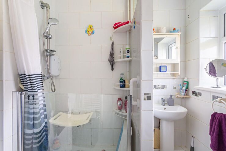 White suite comprising shower cubicle with electric shower over, pedestal was hand basin, low level WC, chrome heated towel rail, tilled floor, tilled walls, double glazed window to front with privacy glass.