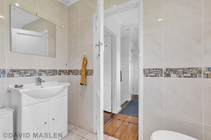 White suite comprising shower cubicle with 'Mira' electric shower, vanity sink basin with mixer tap & cupboard below, low level WC with dual flush, chrome heated towel rail, tiled floor, part tiled walls, double glazed window to rear with privacy glass.
