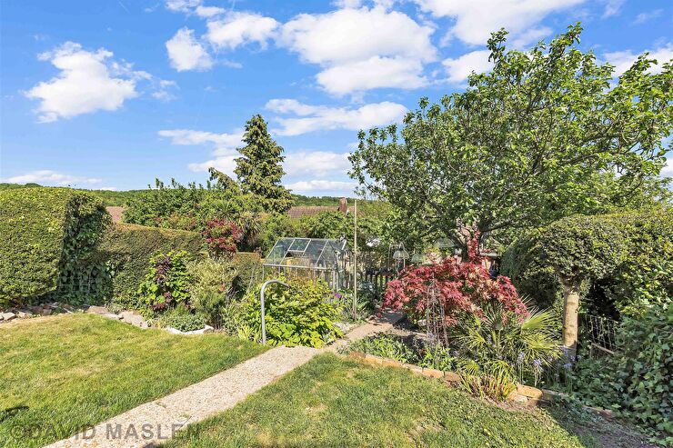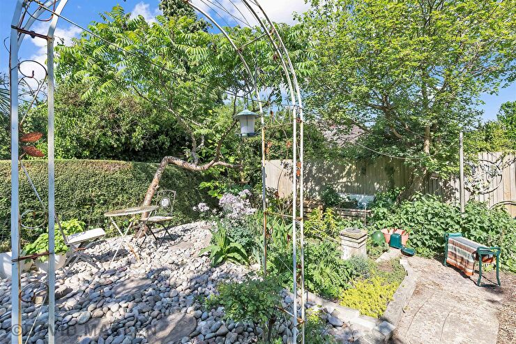 Array of mature trees & shrubs, pathway with steps down to front door, walled & fenced boundaries.