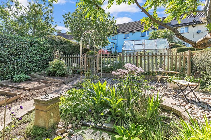4 tiered garden with raised patio area, well kept lawned area, outside tap, array of mature plants, trees, flower beds, green house, shed, pretty far reaching views.