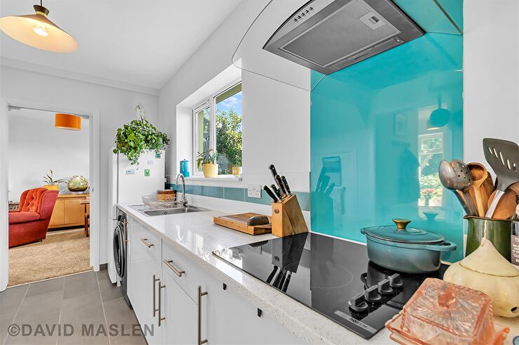 Range of wall & base units with quartz roll edged work surfaces over, inset stainless steel sink unit with mixer tap & drainer, integrated 4 ring 'BOSCH' hob with extractor above, space for tall fridge/freezer, space & plumbing for washing machine, tiled floor, part tiled walls, radiator, understairs storage cupboard housing fusebox & meters, double glazed window to rear with pretty views.