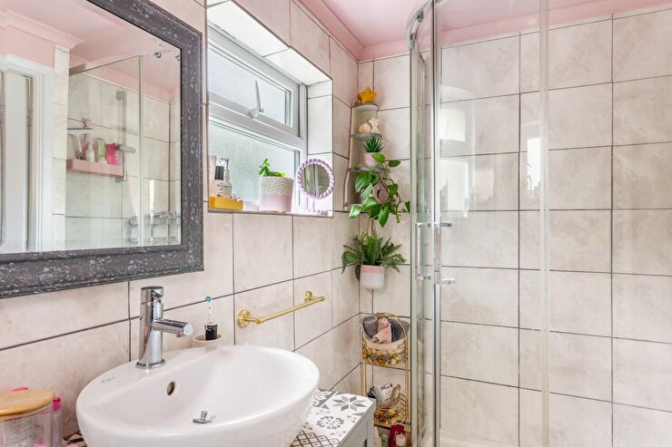 White suite comprising shower cubicle with mains plumber shower over, vanity sink basin with mixer tap & cupboard underneath, low level WC with dual flush, heated towel rail, part tilled walls, tilled flooring, X2 double glazed windows to rear & side with privacy glass.